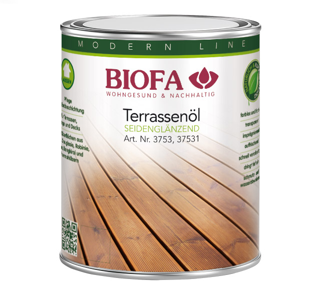 BIOFA Terrassenöl ist eine hochwertige Öl-Harzbeschichtung aus natürlichen Rohstoffen für Terrassenhölzer im Außenbereich wie z. B. Lärche, Douglasie, Robinie, Eiche, Bangkirai, etc. Hochwertige pflanzliche Öle imprägnieren neues, unbehandeltes Holz. Ältere und bereits geölte Hölzer werden wieder aufgefrischt. Terrassenöl lässt sich schnell und leicht verarbeiten. Die natürlichen Öle dringen tief in das Holz ein und schützen es vor Feuchtigkeit. Bei neuen Terrassendielen wird eine beidseitige Behandlung vor dem Verlegen vorgenommen. Terrassendielen müssen grundsätzlich einen Neigungswinkel (Ablaufwinkel) von mind. 2-3% aufweisen, um länger stehendes Wasser zu vermeiden.